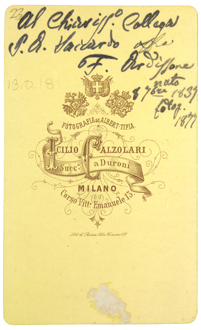 Dedica manoscritta riportata sul verso: Al Chiariss.o Collega P. A. Saccardo [...] F. Ardissone nato 8 sett. 1837 fotog. 1899.