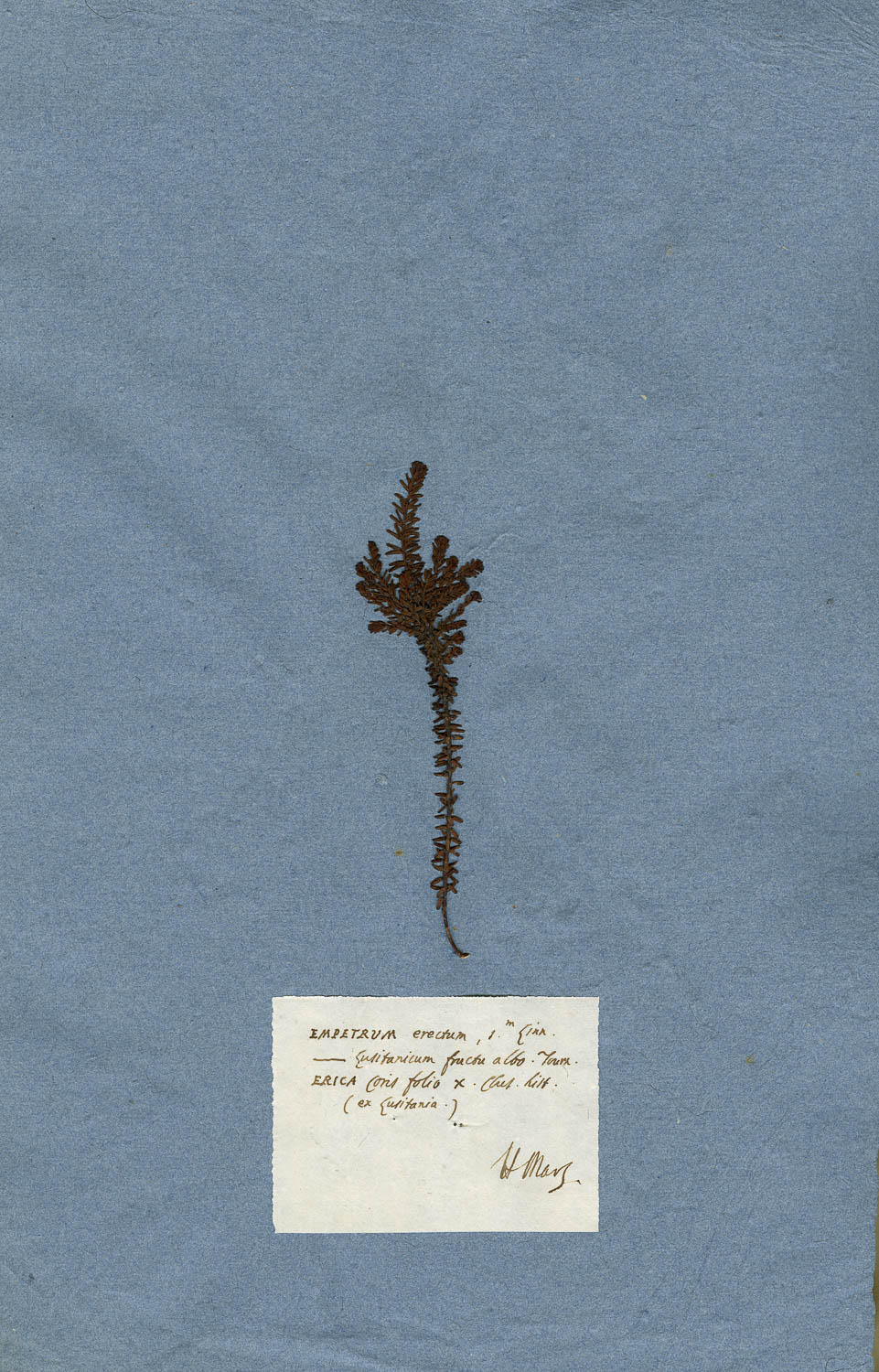 Foglio dell'erbario di Giovanni Marsili con cartellino manoscritto: EMPETRUM erectum, 1.m Linn.