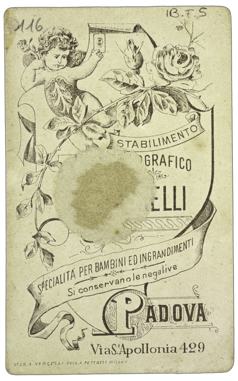 Titolo manoscritto e data di nascita riportati sul recto, dove compare anche la data di scatto della foto (1899) e la nota: da fot. prest. da S. Belli.