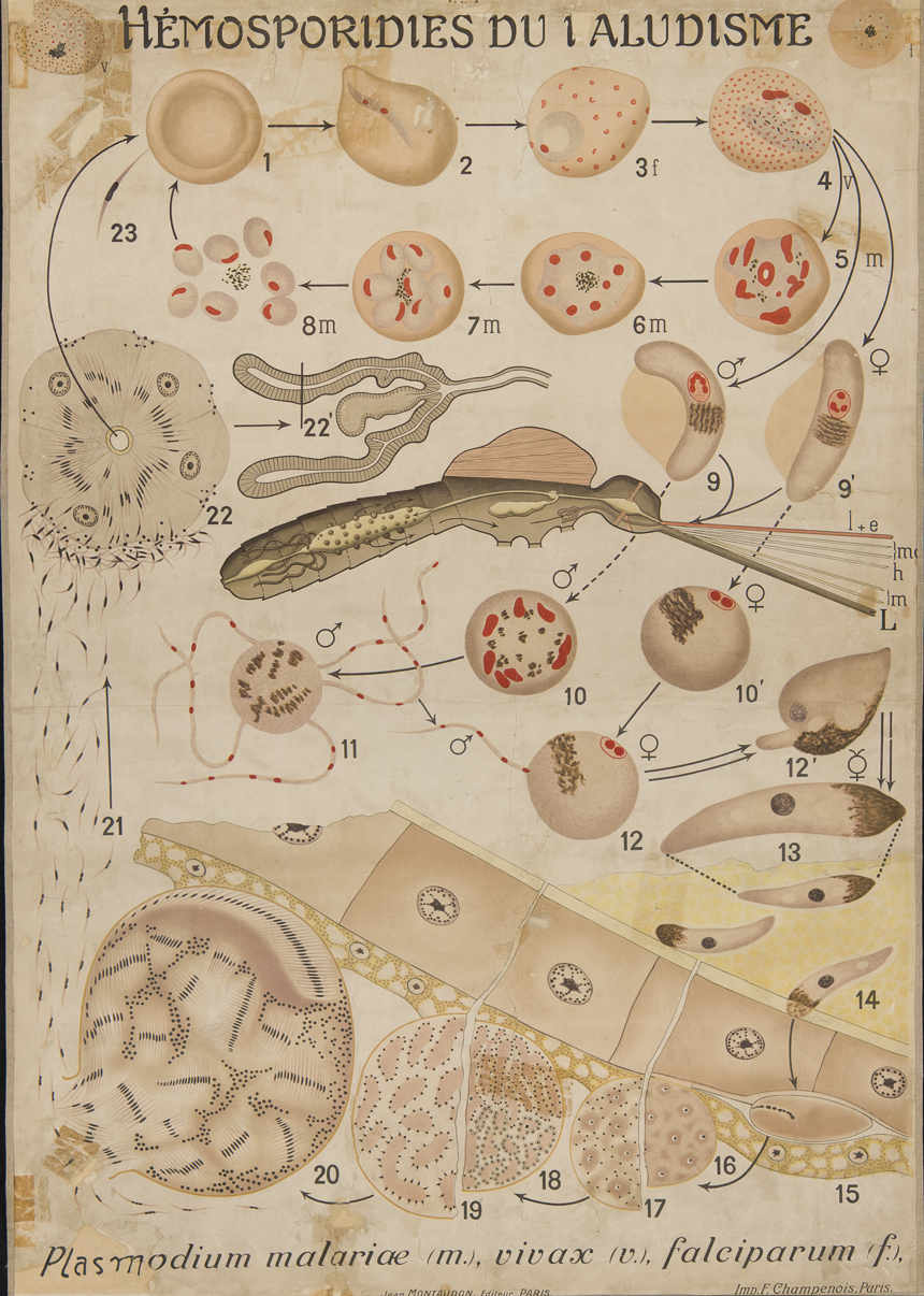 Ciclo degli agenti patogeni di tre forme di malaria nello stomaco dell’ospite definitivo (zanzara), nelle cellule del fegato e negli eritrociti di vertebrati, ospiti intermedi.