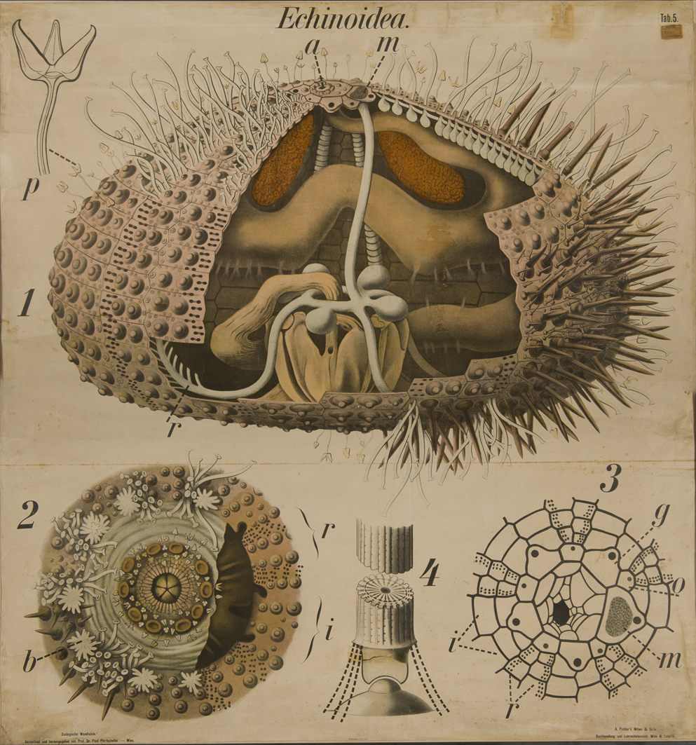 1) Struttura esterna, con pedicelli e spine, ed interna di echinoideo regolare: lanterna di Aristotele; sistema digerente, con ano nel periprocto, al polo aborale. Sistema ambulacrale con canale anulare, vescicole del Poli, canali radiali, ampolle e pedicelli, canale petroso, che sbocca nel madreporite (m). Pedicellaria (p).
