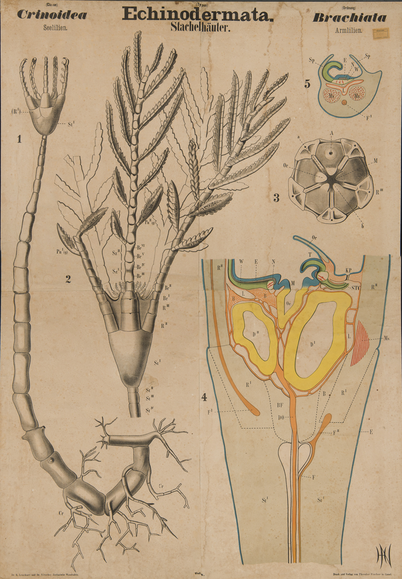 1, 2) Esemplare peduncolato con corona, da cui si dipartono le braccia, dotate di pinnule.