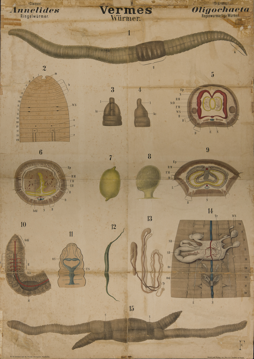 Lombrico (Lumbricidae) con clitello evidente (1); prostomio e segmenti anteriori (2, 3, 4); sezioni trasversali a livelli differenti (5, 6, 9); sistema circolatorio (10); gangli cerebrali, cingolo periesofageo e catena nervosa ventrale (11); metanefridio (13); sezione con sistemi riproduttori maschile e femminile (14); due individui in copula (15).