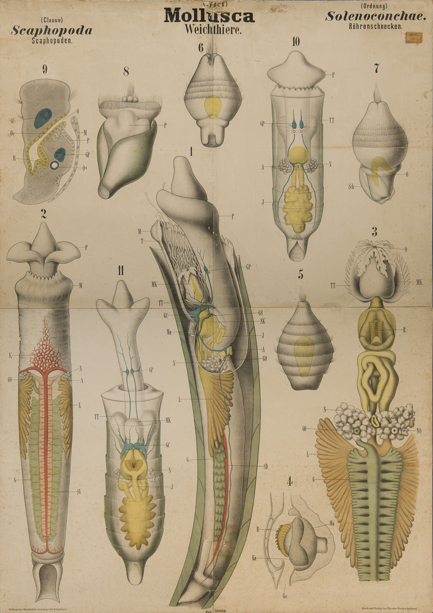 1) Visione generale dell‘anatomia di uno scafopode, Dentalium. Conchiglia tubulare, simile ad una zanna, aperta alle due estremità. All‘estremità infossata più ampia è presente il piede muscoloso estensibile, i captacula, lunghi e filamentosi che esplorano gli spazi pieni d‘acqua tra i granelli di sabbia per scegliere e trattenere le particelle di cibo, che vengono passate alla bocca.