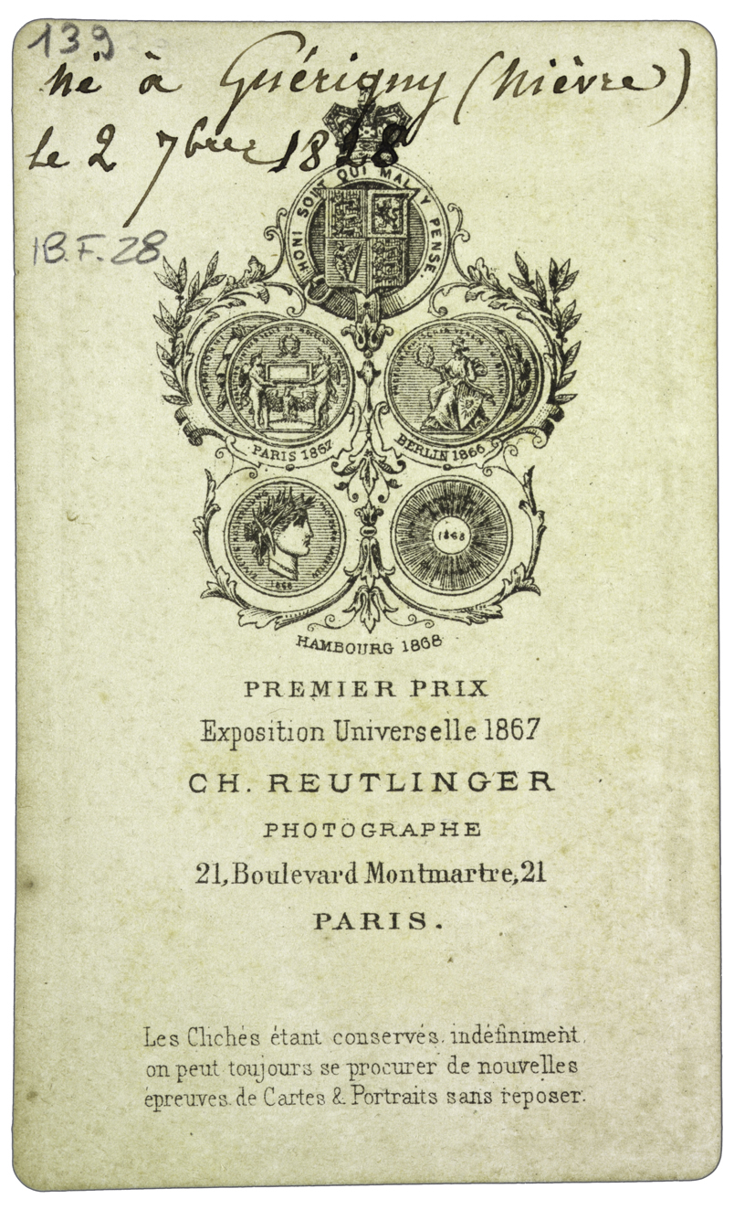 Titolo manoscritto sul recto, dove compaiono anche le note: R. Tod. [Raccolta Todaro]; n. Guérigny 7 Sept. 1828. Montata su cartoncino 104 x 63 mm.