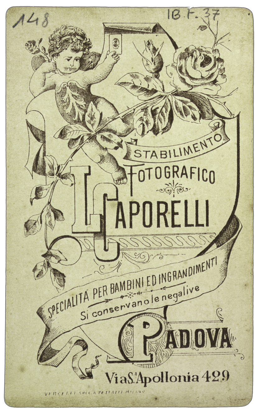 Titolo sul recto. Riproduzione fotografica da un disegno, montata su cartoncino 105 x 65 mm.