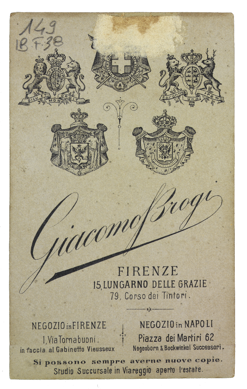 Titolo manoscritto sul recto, dove compaiono anche le note: nato a Lucca, 4 dic. 1850; fotograf. in ottobre 1898. Montata su cartoncino 103 x 63 mm.