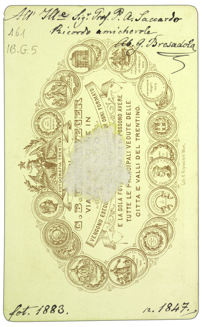 Nota manoscritta anche sul verso: All’Ill.e Sig.r Prof. P. A. Saccardo ricordo amichevole Ab. G. Bresadola; fot. 1883; n. 1847.