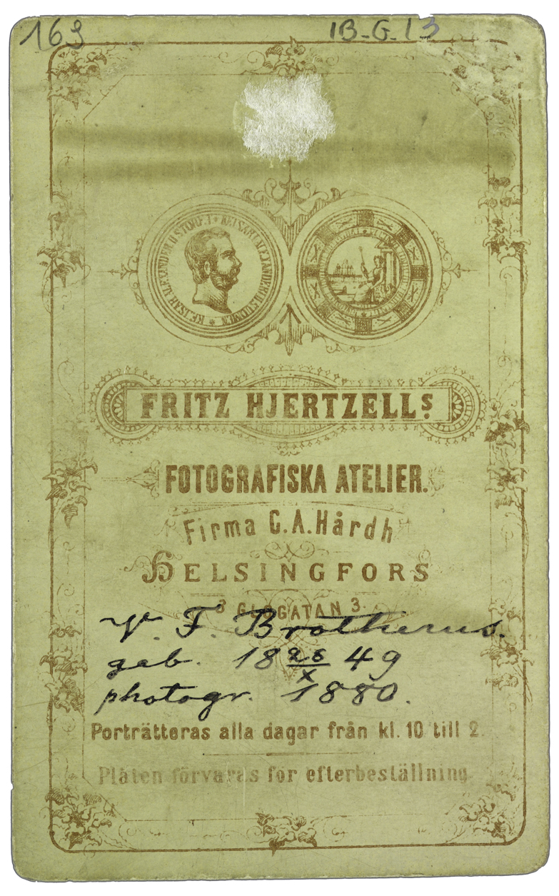 Nota manoscritta sul verso: V. F. Brotherus geb. 1849 28 X photogr. 1880.