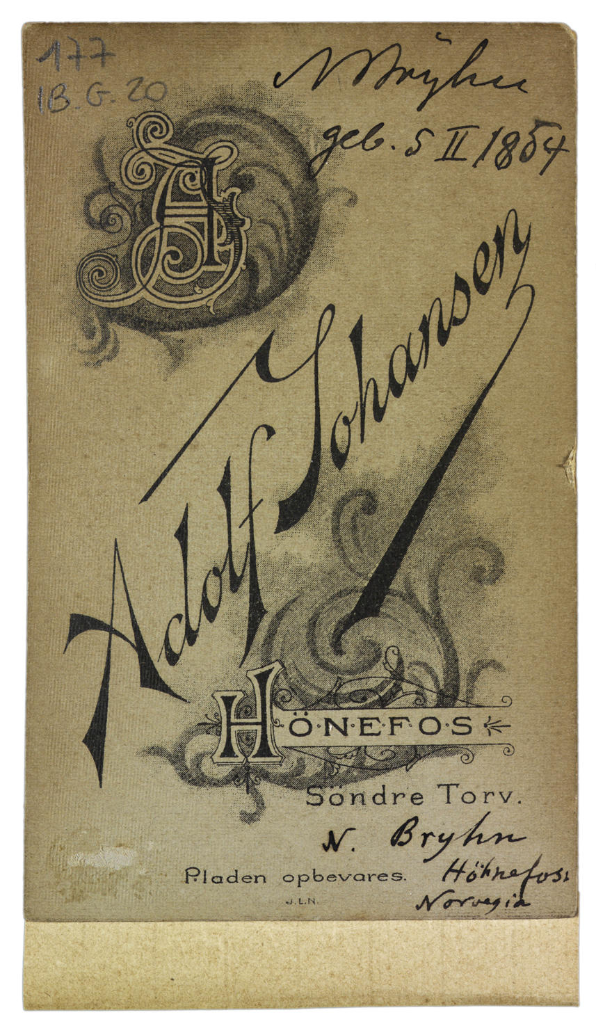 Sul verso compare anche la nota: [...] geb. 5 II 1854, N. Bryhn Hohnefoss Norvegia. Montata su cartoncino 106 x 65 mm.
