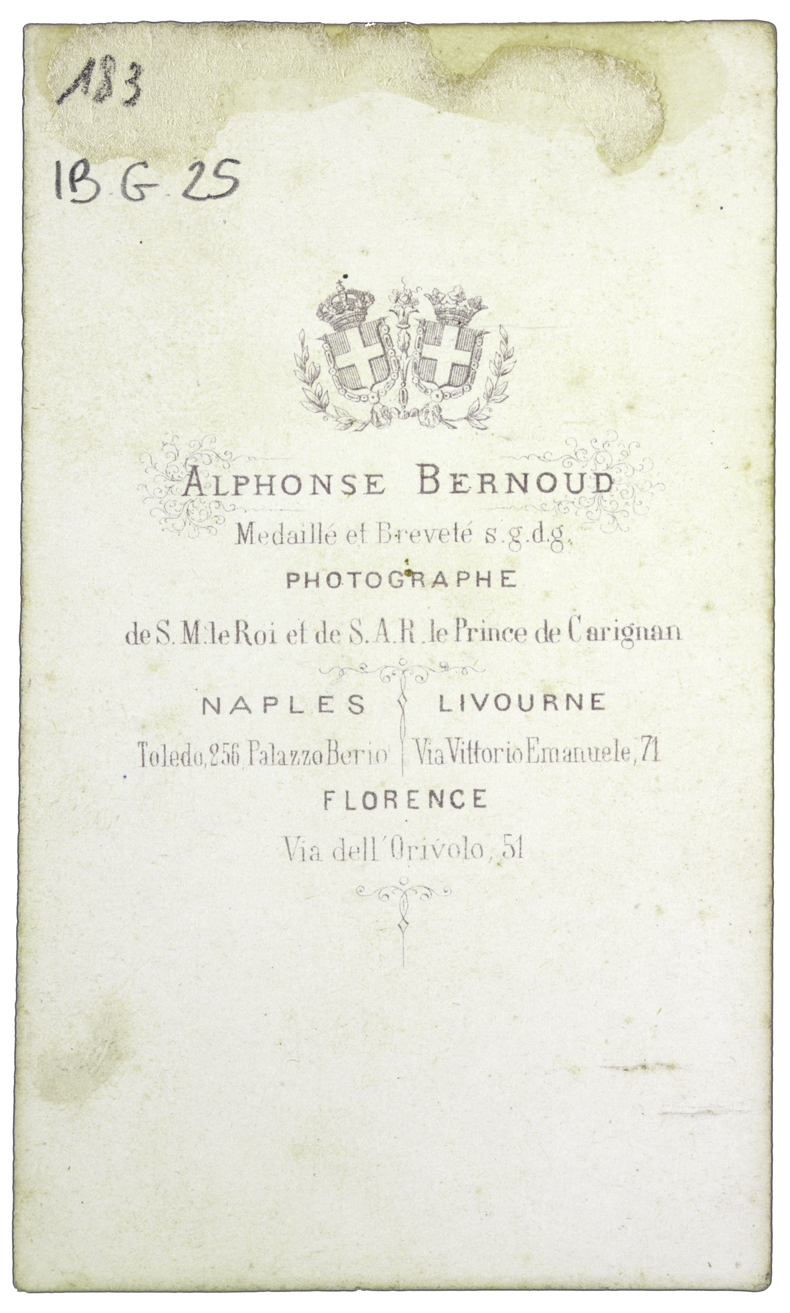 Titolo manoscritto sul recto, dove compaiono anche le note: nato il 20 Ottobre 1849; morto il 16 marzo 1870; Dono di O. Mattirolo VI- 1907. Montata su cartoncino 105 x 61 mm.