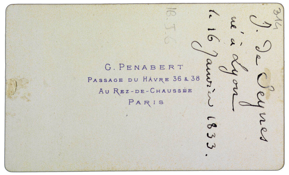 Nota manoscritta sul verso: J. de Seynes né à Lyon le 16 Janvier 1833. Montata su cartoncino 105 x 63 mm.