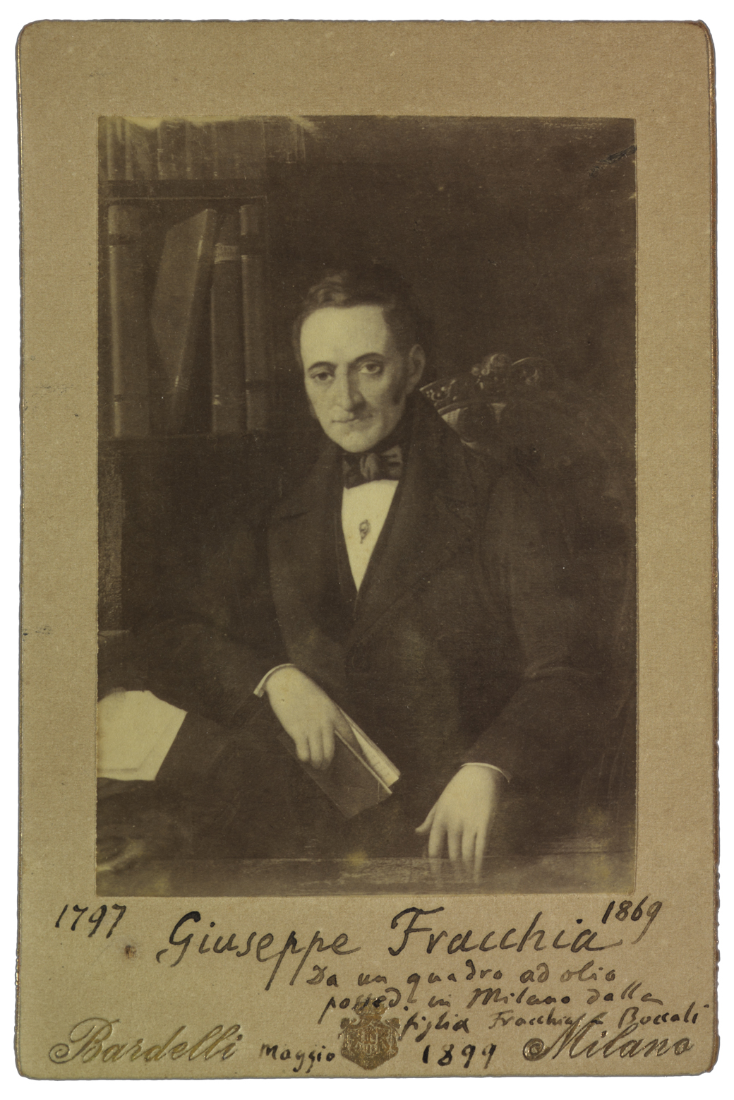 Titolo ed estremi cronologici riportati manoscritti sul recto, dove compare anche la nota: Da un quadro ad olio possed. in Milano dalla figlia Fracchia Boccali, maggio 1899.