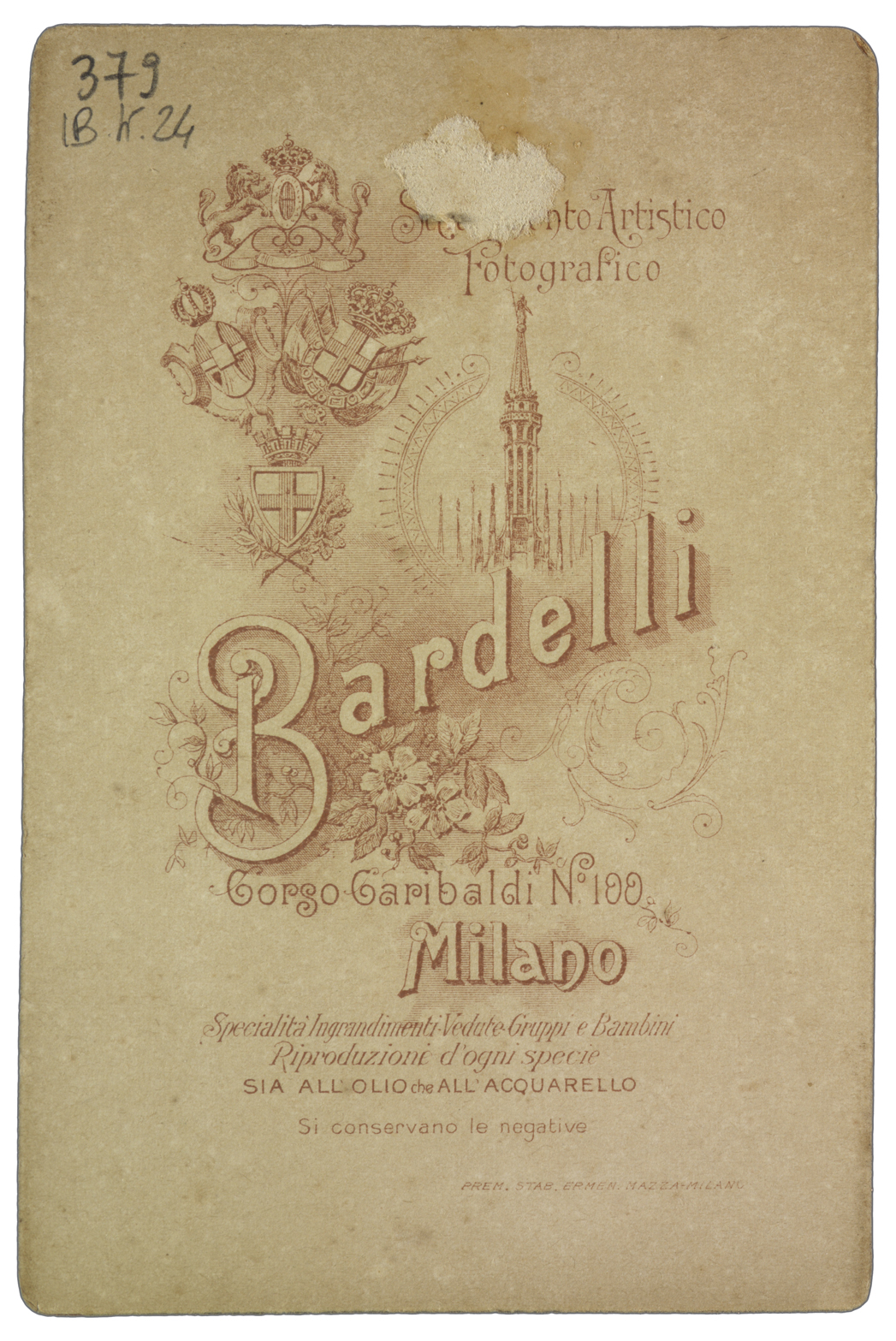 Titolo ed estremi cronologici riportati manoscritti sul recto, dove compare anche la nota: Da un quadro ad olio possed. in Milano dalla figlia Fracchia Boccali, maggio 1899.