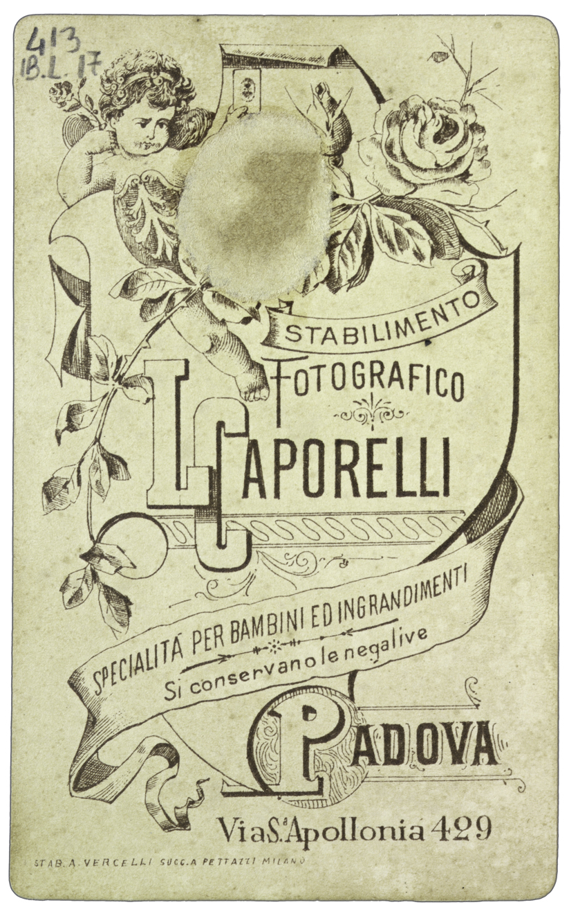 Titolo ed estremi cronologici riportati manoscritti sul recto, dove compare anche la nota: 1899 - Da fot. prest. da Sav. Belli.