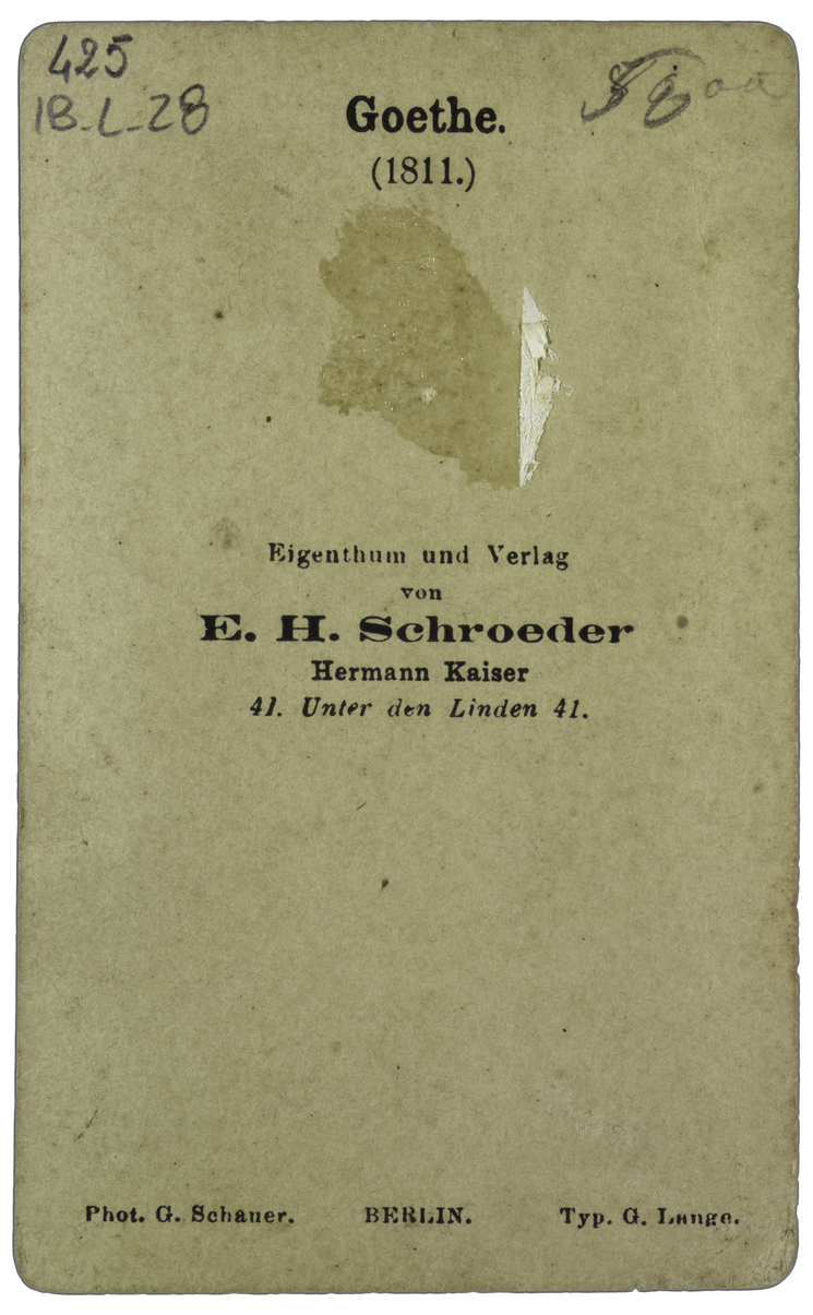 Sul verso presente scritta a caratteri tipografici con riferimento al soggetto e alla data di scatto della foto inviata a P.A.Saccardo: Goethe (1811).
