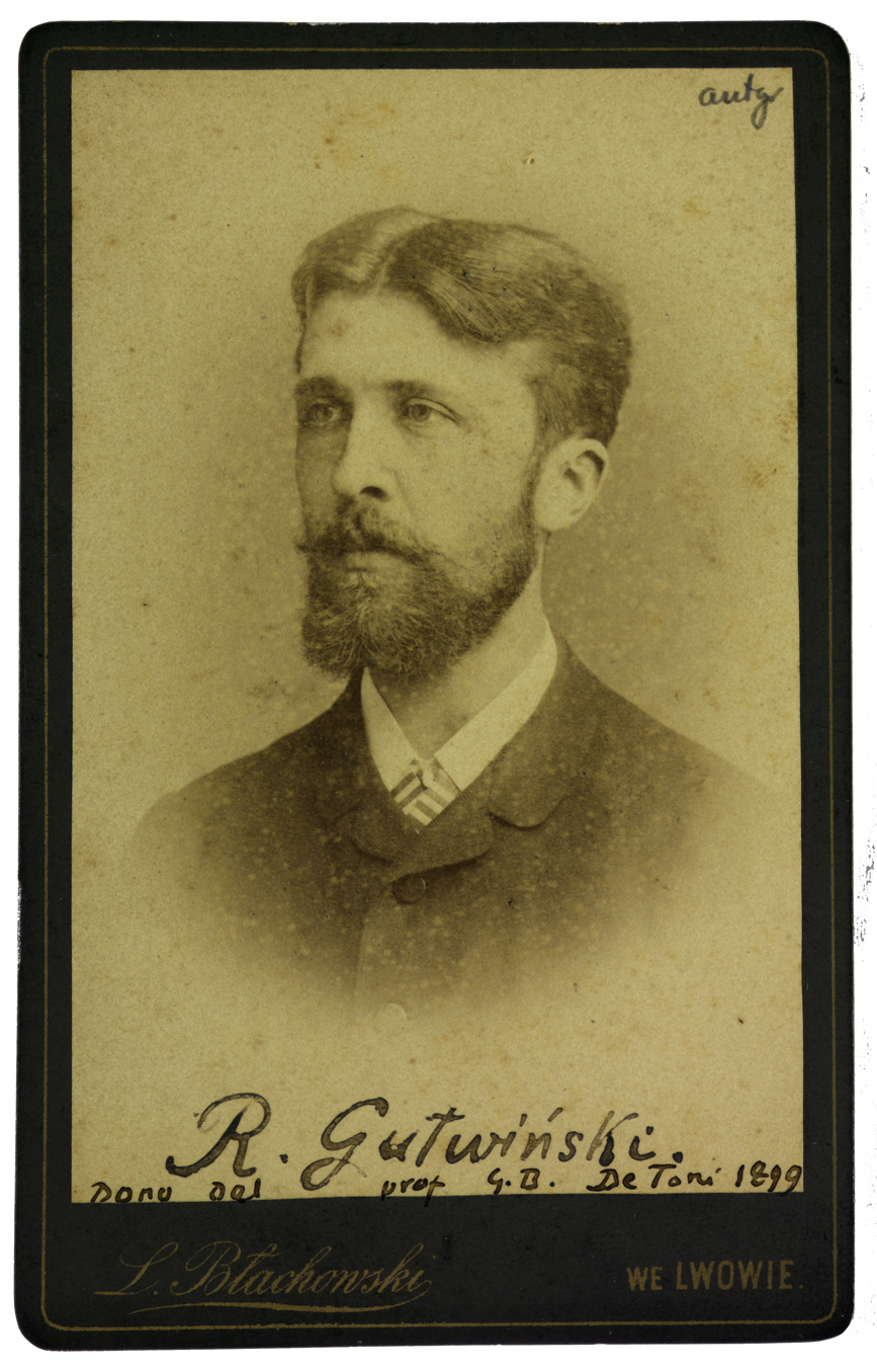 Presenti invece sul verso le note: 20/V.888 r; À Monsieur le Doct. J. B. De Toni le Docent au l’Université du Padoua souvenir affectueux de R. Gutwiński Tarmf[...]l 15.VIII.1890.