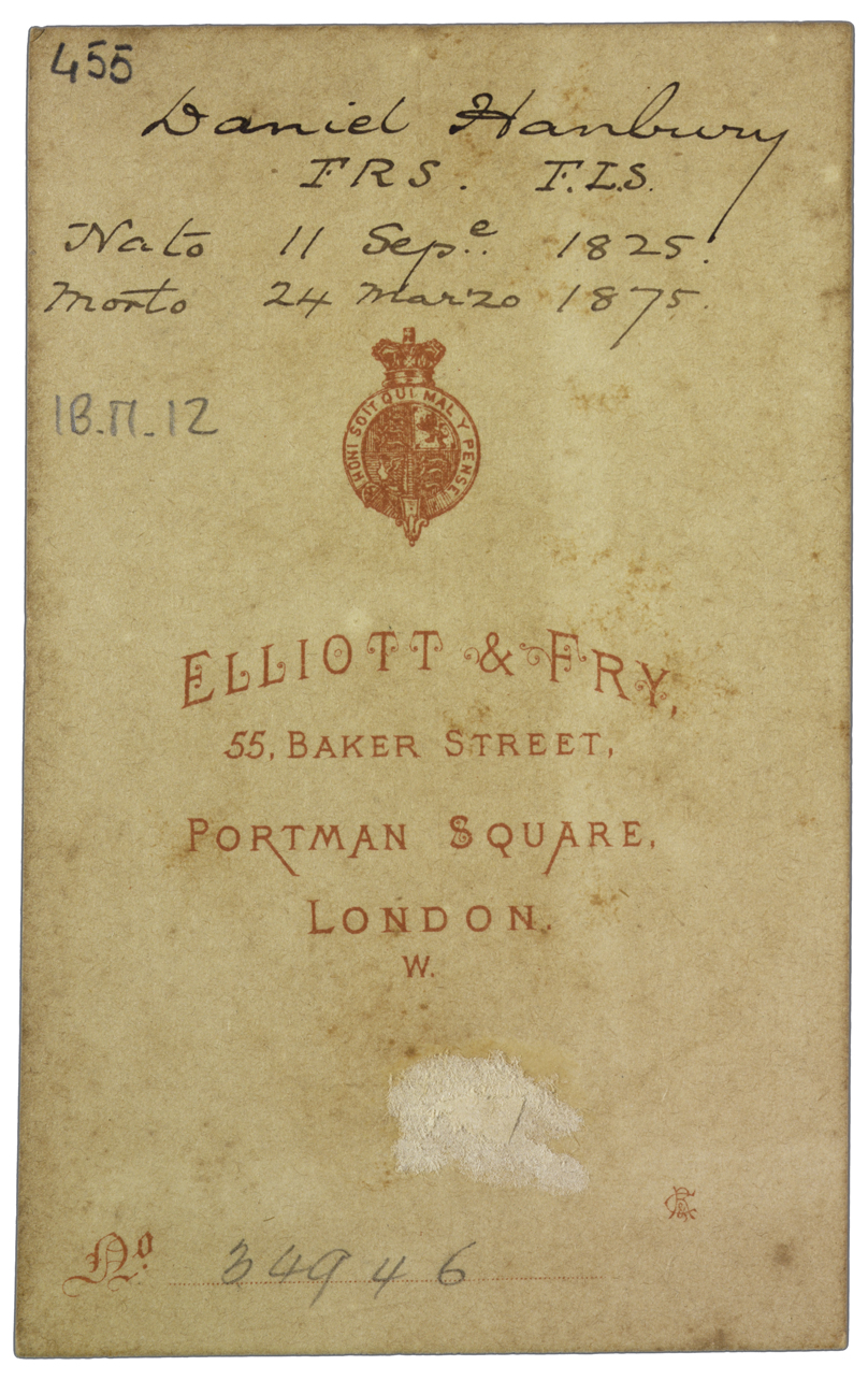 Titolo manoscritto sul recto, dove, oltre agli estremi cronologici, è riportata la nota: R. Tod. [Raccolta Todaro]. Nota anche sul verso: Daniel Hanbury FRS F.L.S. Nato 11 Sep.e 1825 Morto 24 Marzo 1875.