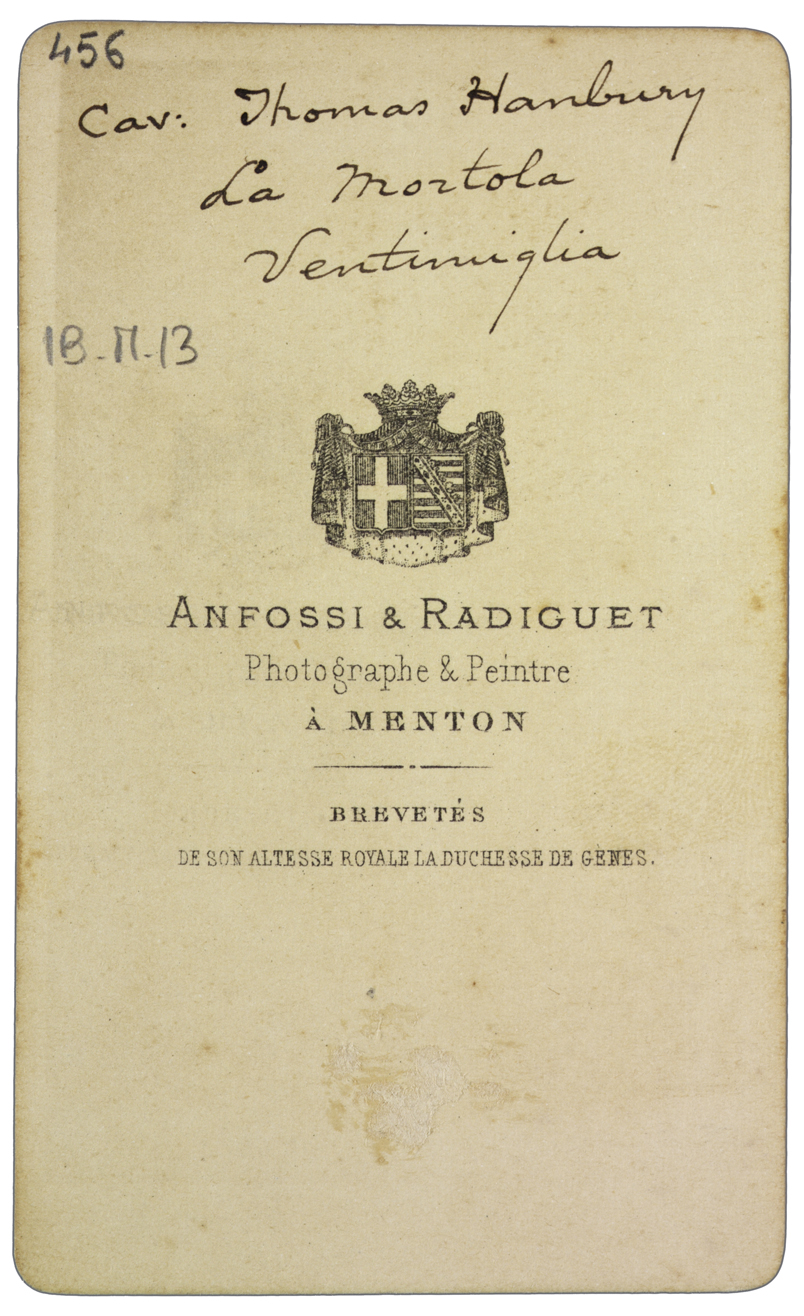 Titolo manoscritto sul recto, dove compare anche la nota: R. Tod. [Raccolta Todaro]. Nota manoscritta sul verso: Cav: Thomas Hanbury La Mortola Ventimiglia.