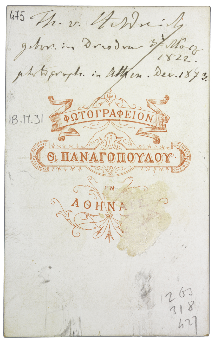 Titolo manoscritto sul recto, dove, oltre alla data di nascita (n. 1822) e la data della foto (f. 1873), compare la nota: Racc. [Raccolta] Levier 1912. Nota manoscritta anche sul verso: Th. v. Heldreich gebor. in Dresda 3 Marz 1822 photograph. in Athen Dec. 1873.