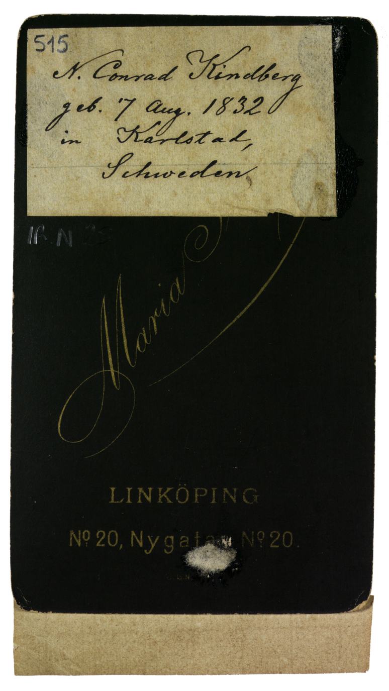 Nota manoscritta su carta incollata sul verso: N. Conrad Kindberg geb. 7 Aug. 1832 in Karlstad. Schweden.
