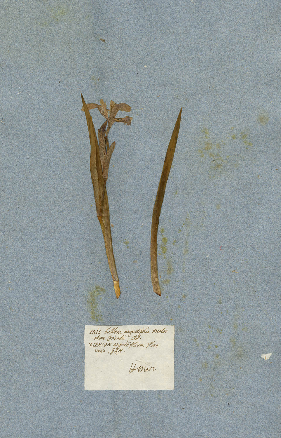 Foglio dell'erbario di Giovanni Marsili con cartellino manoscritto: IRIS bulbosa angustifolia tricolor odore Coriandri, CBP.
