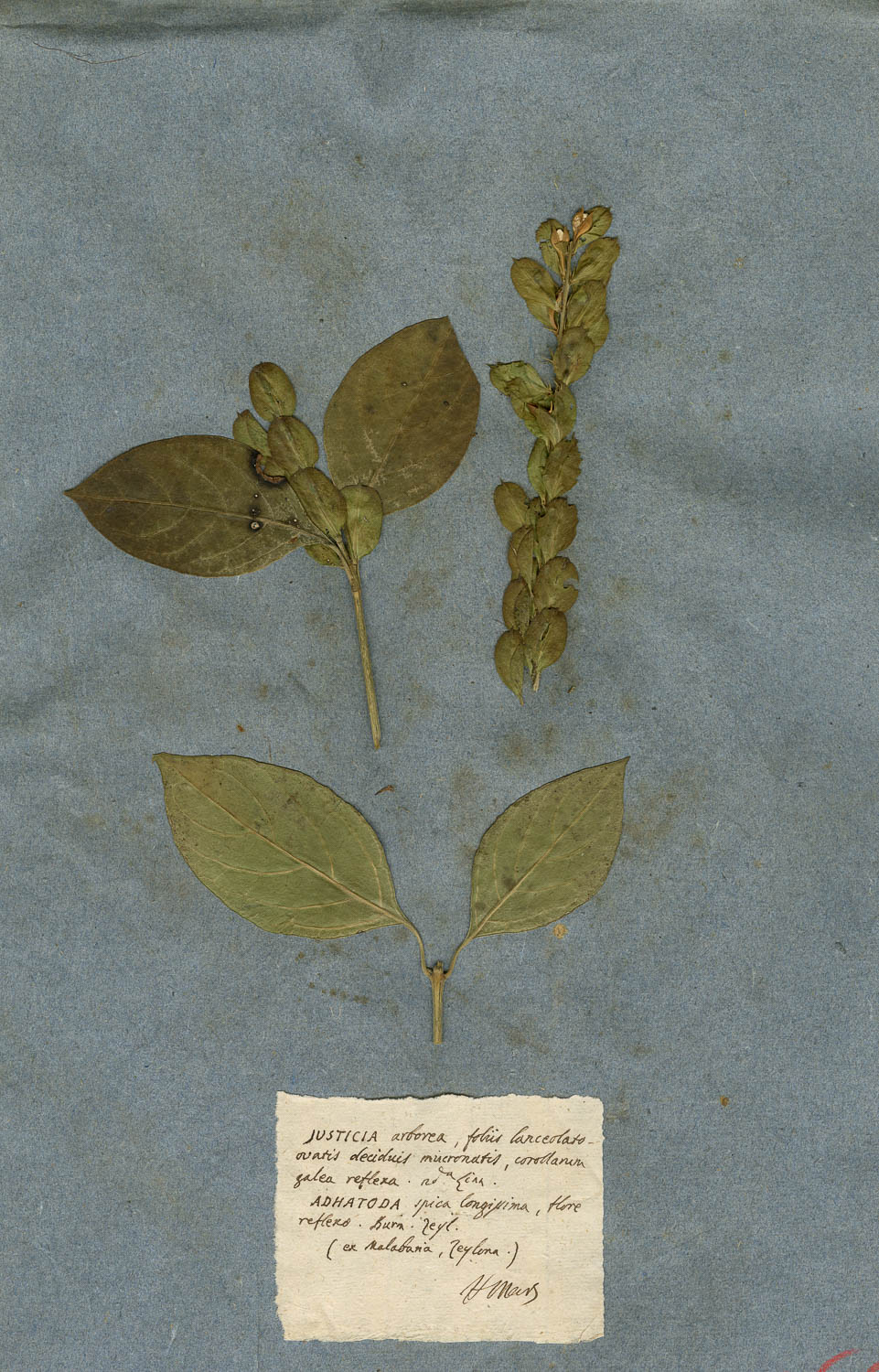 Foglio dell'erbario di Giovanni Marsili con cartellino manoscritto: JUSTICIA arborea, foliis laceolato-ovatis deciduis mucronatis, corollarum galea reflexa. 2d.a Linn.
