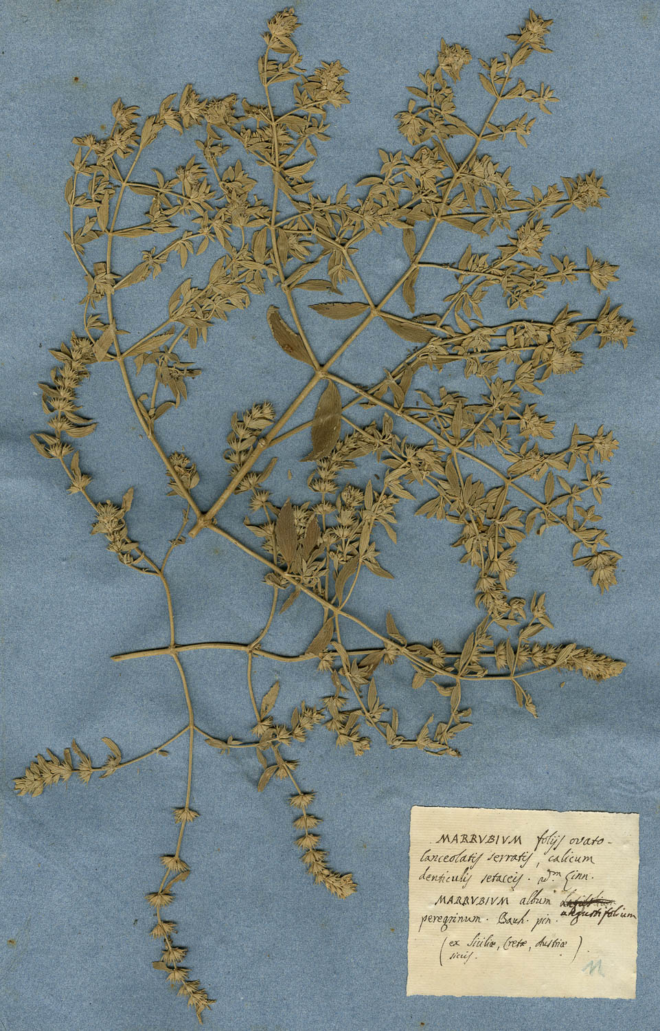 Foglio dell'erbario di Giovanni Marsili con cartellino manoscritto: MARRUBIUM foliis ovato-lanceolatis serratis, calicum denticulis setaceis. 2d.m Linn.