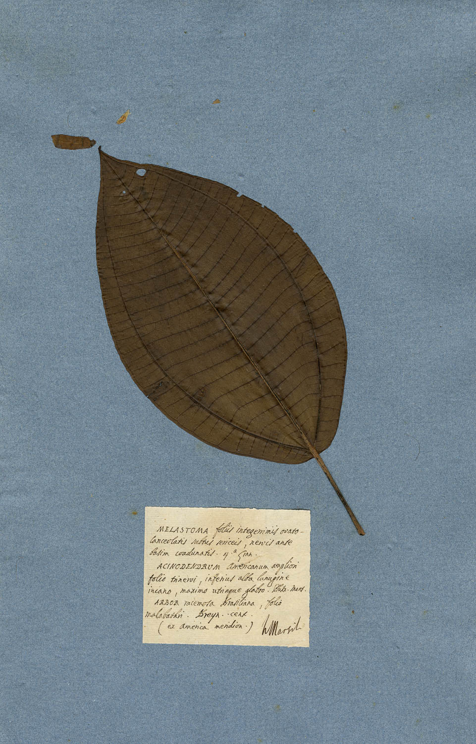 Foglio dell'erbario di Giovanni Marsili con cartellino manoscritto: MELASTOMA foliis integerrimis ovato-lanceolatis subtus sericeis, neriis ante basim coadunatis. 4.a Linn.
