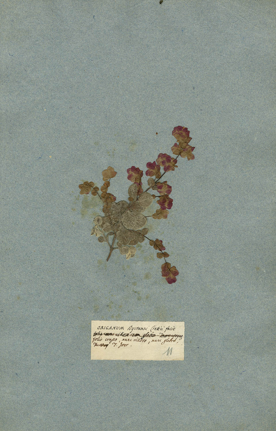 Foglio dell'erbario di Giovanni Marsili con cartellino manoscritto: Origanum Dyctamni Cretici facie folio crasso, nunc villoso, nunc glabro, Tourn. T. Jter.