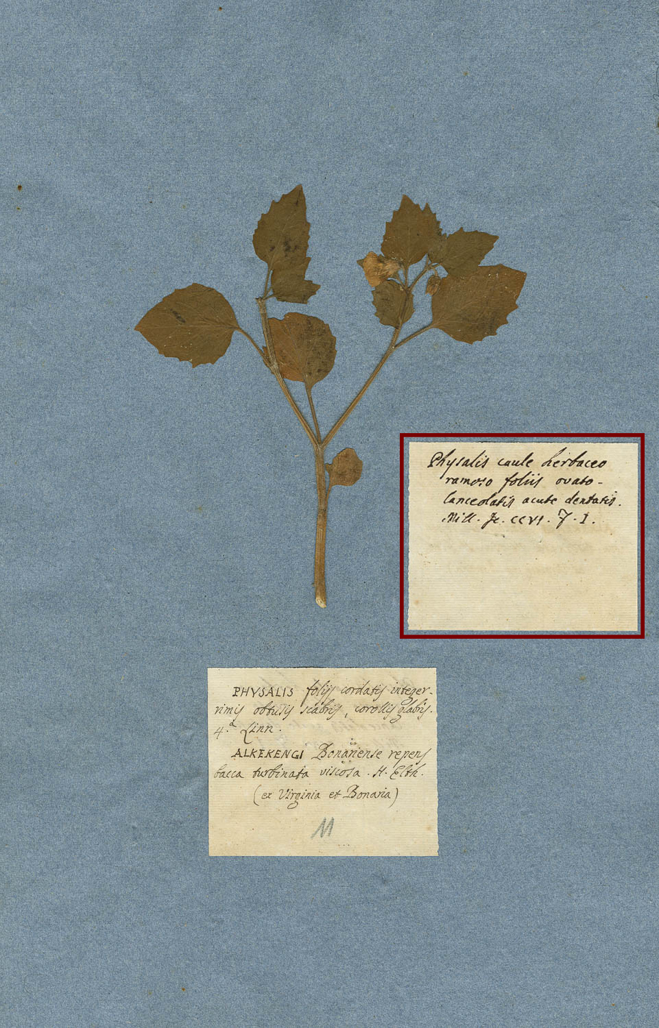 Secondo cartellino manoscritto: Physalis caule herbaceo ramoso foliis ovato-lanceolatis acute dentatis. Mill. Jc. CCVI. F. I.