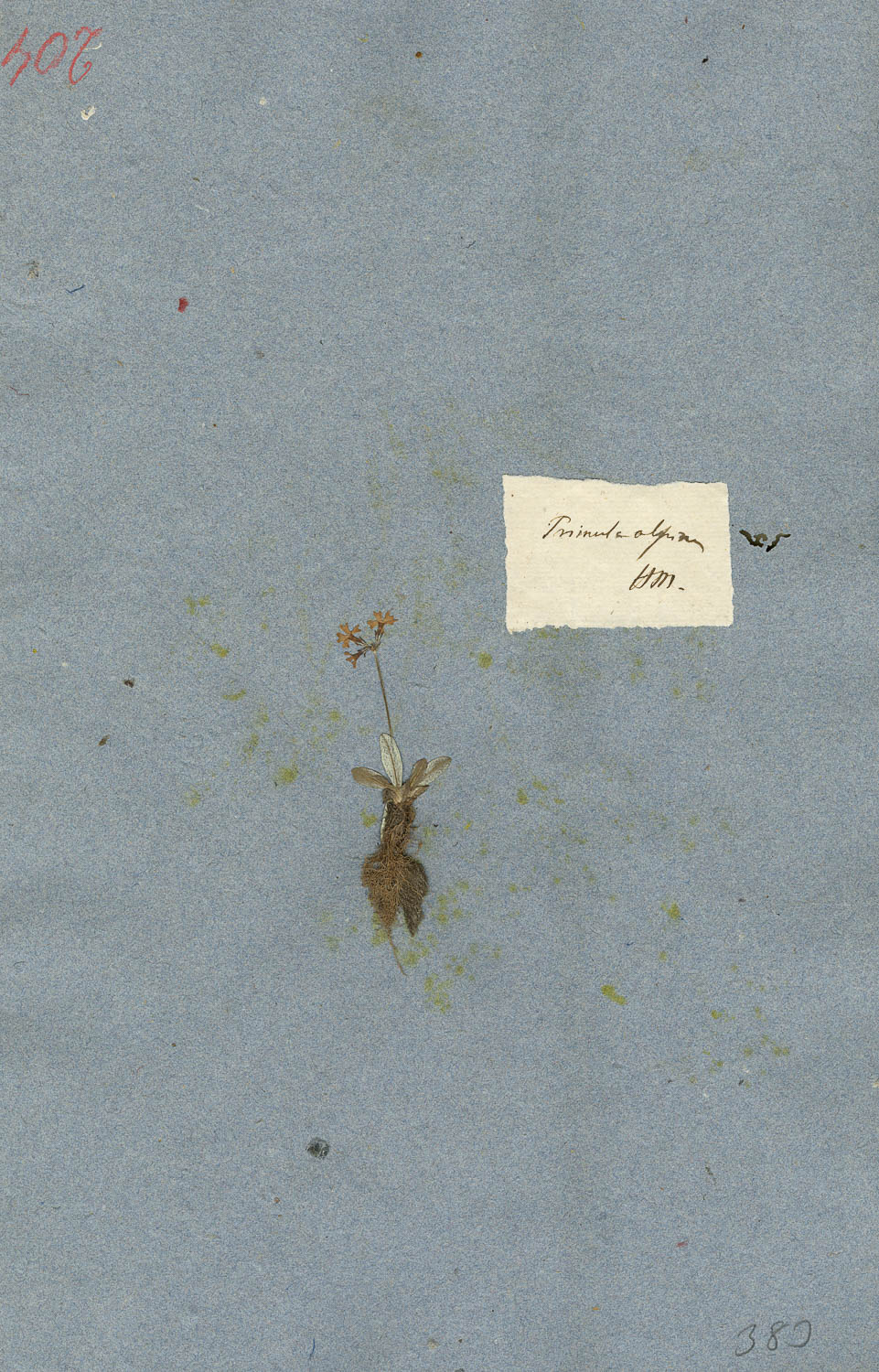 Foglio dell'erbario di Giovanni Marsili con cartellino manoscritto: Primula alpina
