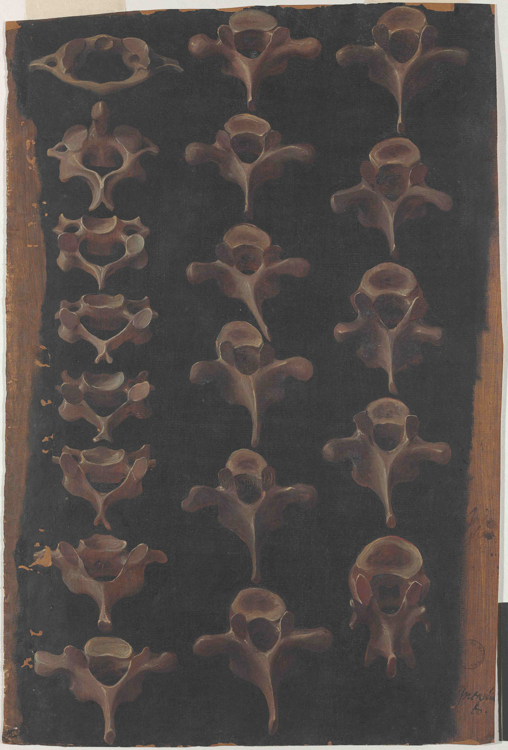 • Vertebre cervicali e dorsali, ossa, Girolamo Fabrici Acquapendente, Fabricius, tavole anatomiche, pitture colorate anatomia, Theatrum totius animalis fabricae, De anatomia ossium, teatro dei corpi
