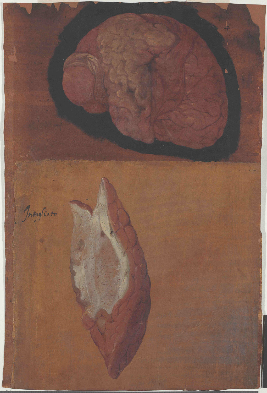 • Emisferi cerebrale destro, Girolamo Fabrici Acquapendente, Fabricius, tavole anatomiche, pitture colorate anatomia, Theatrum totius animalis fabricae, De anatomia capitis et cerebri nervorum, teatro dei corpi