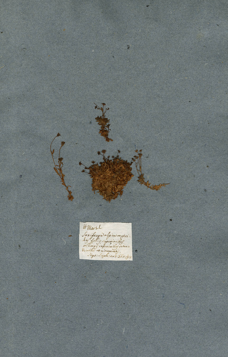Saxifraga alpina muscoides foliis superioribus oblongis inferioribus rotundibus et circumactis.