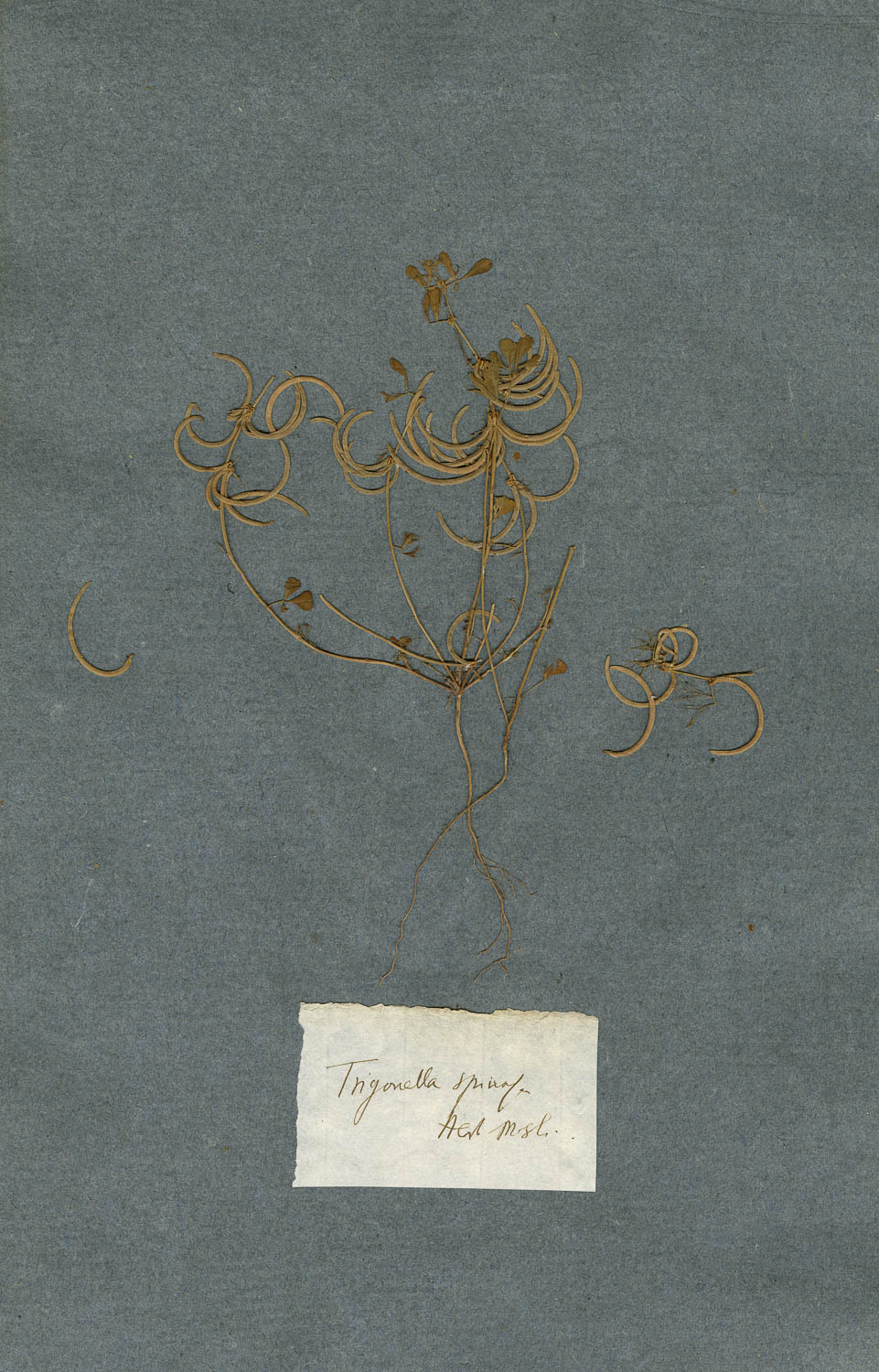 Foglio dell'erbario di Giovanni Marsili con cartellino manoscritto: Trigonella spinosa.