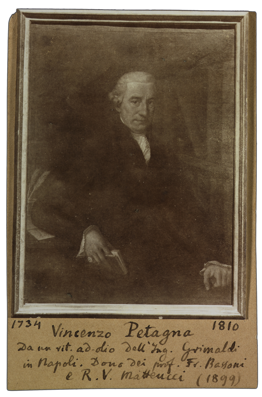 Titolo ed estremi cronologici riportati manoscritti sul recto, dove compare anche la nota: Da un rit. dell’Ing. Grimaldi in Napoli. Dono dei prof. Fr. Bassani e R. V. Matteucci (1899).