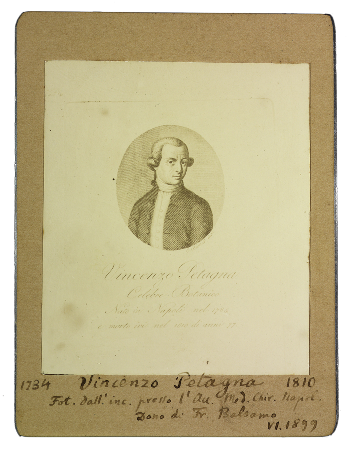 Titolo ed estremi cronologici riportati manoscritti sul recto, dove compare la nota: Fot. dall’inc. presso l’Acc. Chir. Napoli. Dono di Fr. Balsamo VI. 1899.
