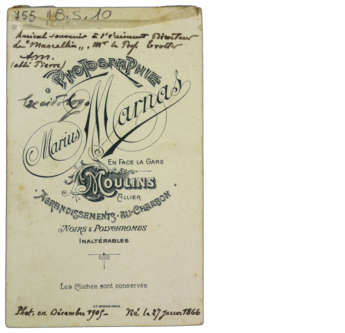 Note manoscritte sul verso: Amical souvenir à l’èminent Directeur de "Marcellin" Mr. le Prof. Trotter AM. (abbè Pierre); Phot. en Décembre 1905 - Né le 27 janv. 1866.