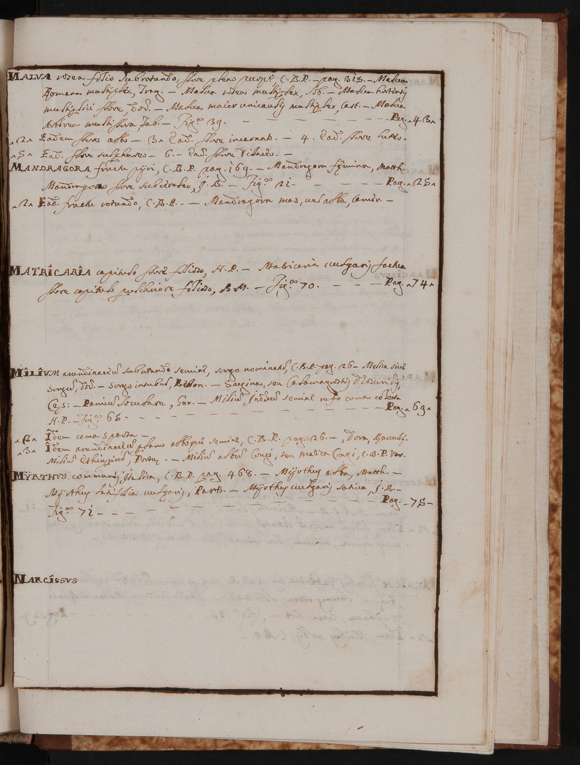 Erbario manoscritto, disegnato e dipinto a mano, contenente 100 piante erbacee ed arboree, in tavole numerate, sotto la pianta nomenclatura Bauhiniana e nomencaltura linneana aggiunta a matita da P.A. Saccardo.
