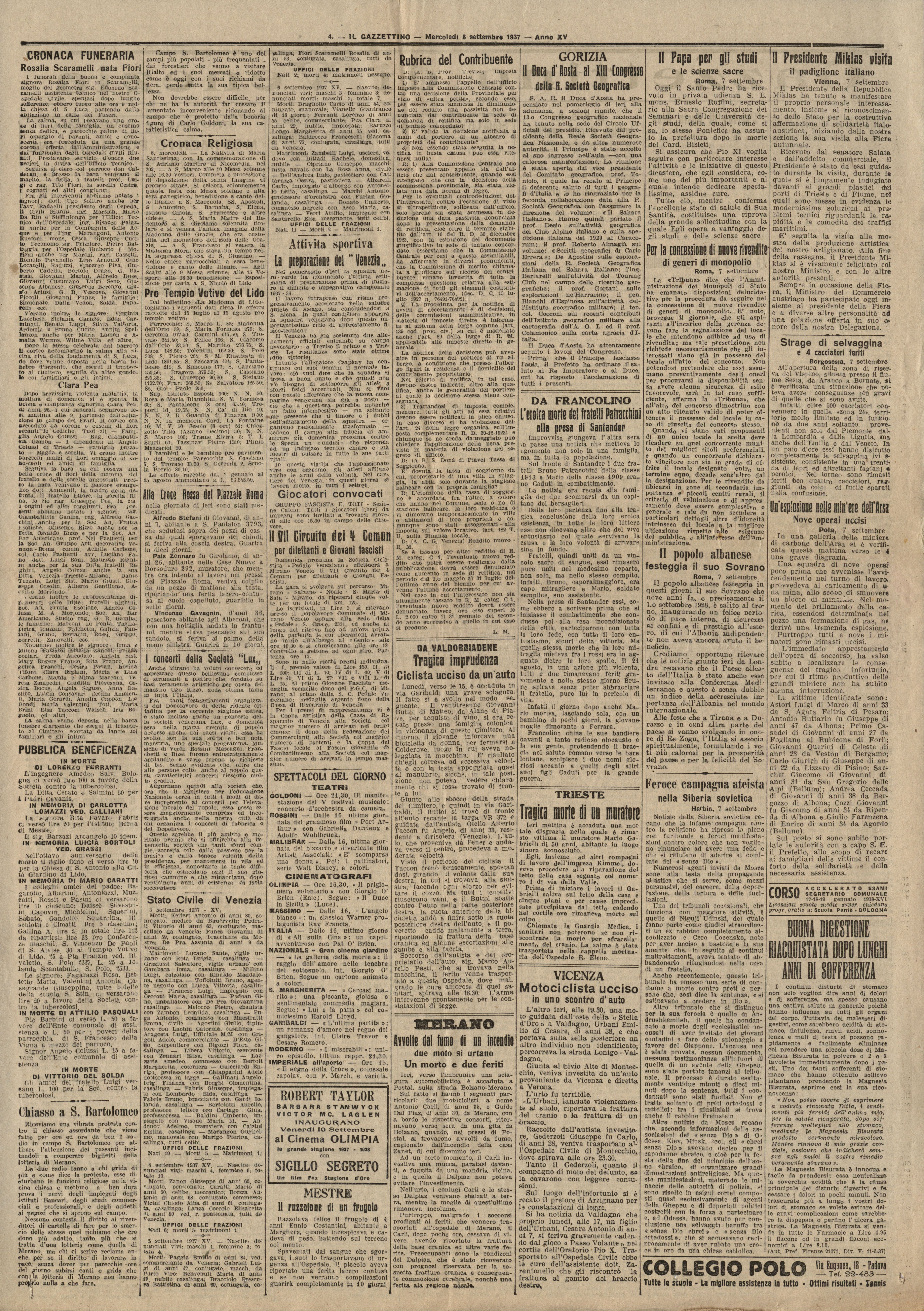 Gazzettino di Venezia - Mercoledì 8 settembre 1937. Rassegna stampa SIPS 1937 (verso)