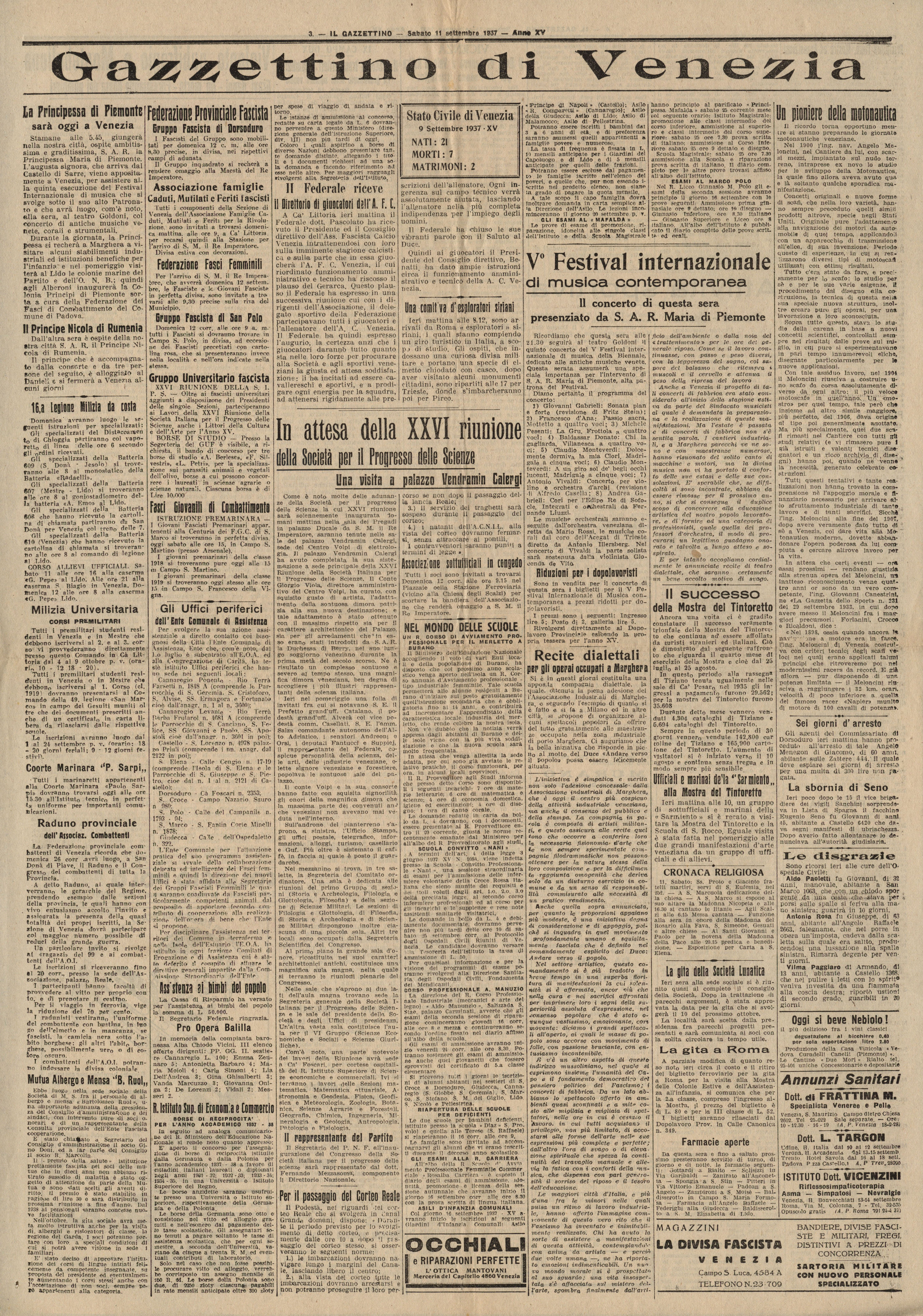 Gazzettino di Venezia - Sabato 11 settembre 1937. Rassegna stampa SIPS 1937 (recto)