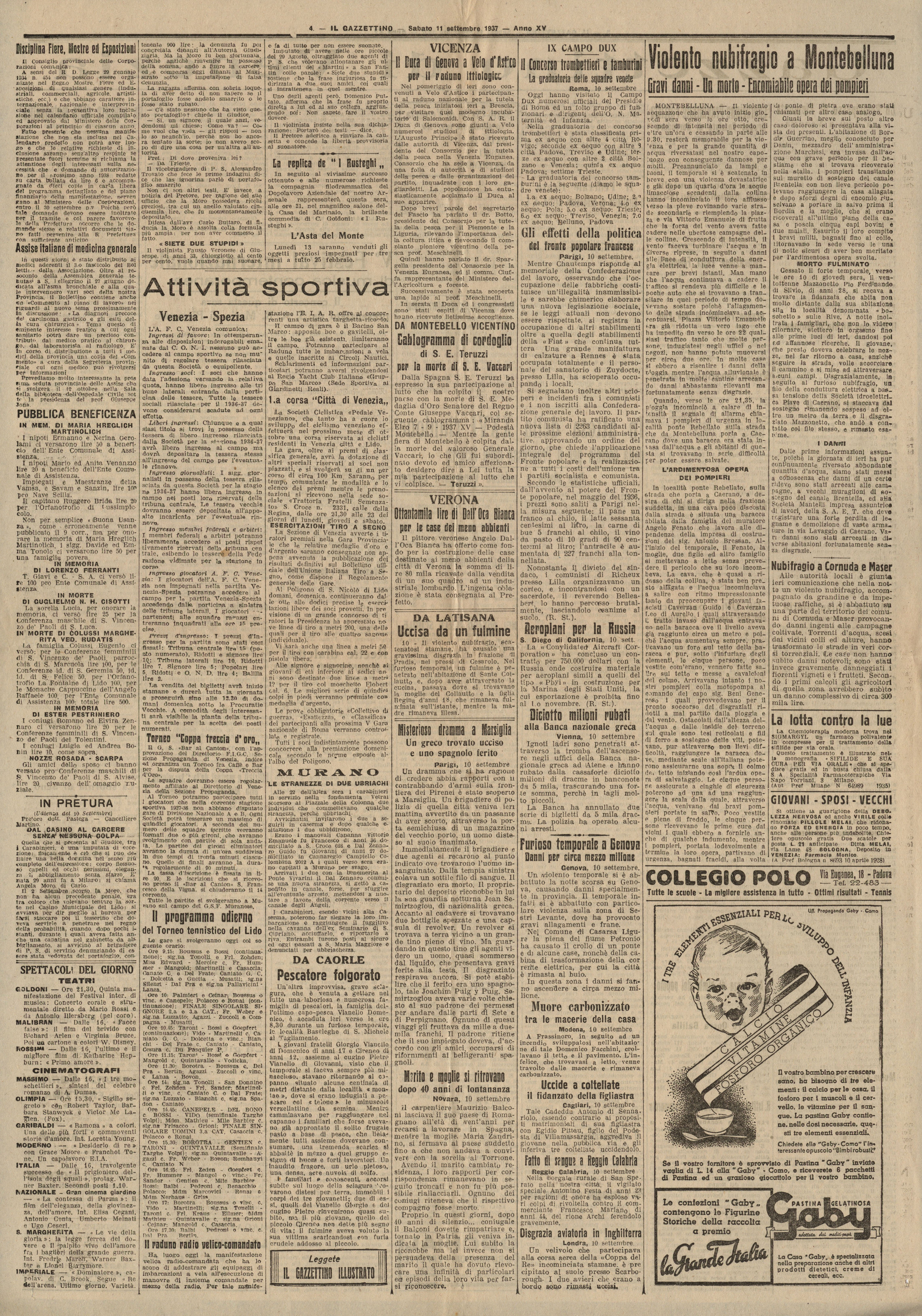 Gazzettino di Venezia - Sabato 11 settembre 1937. Rassegna stampa SIPS 1937 (verso)
