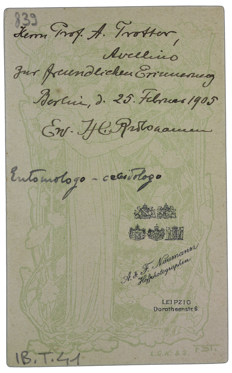 Nota manoscritta sul verso: Hernn Prof. A. Trotter Avellino zur [...]ndlichen Erinne[...] Berlin, d. 25 Februar 1905 En. H. Rubsaamen entomologo - cecidologo.