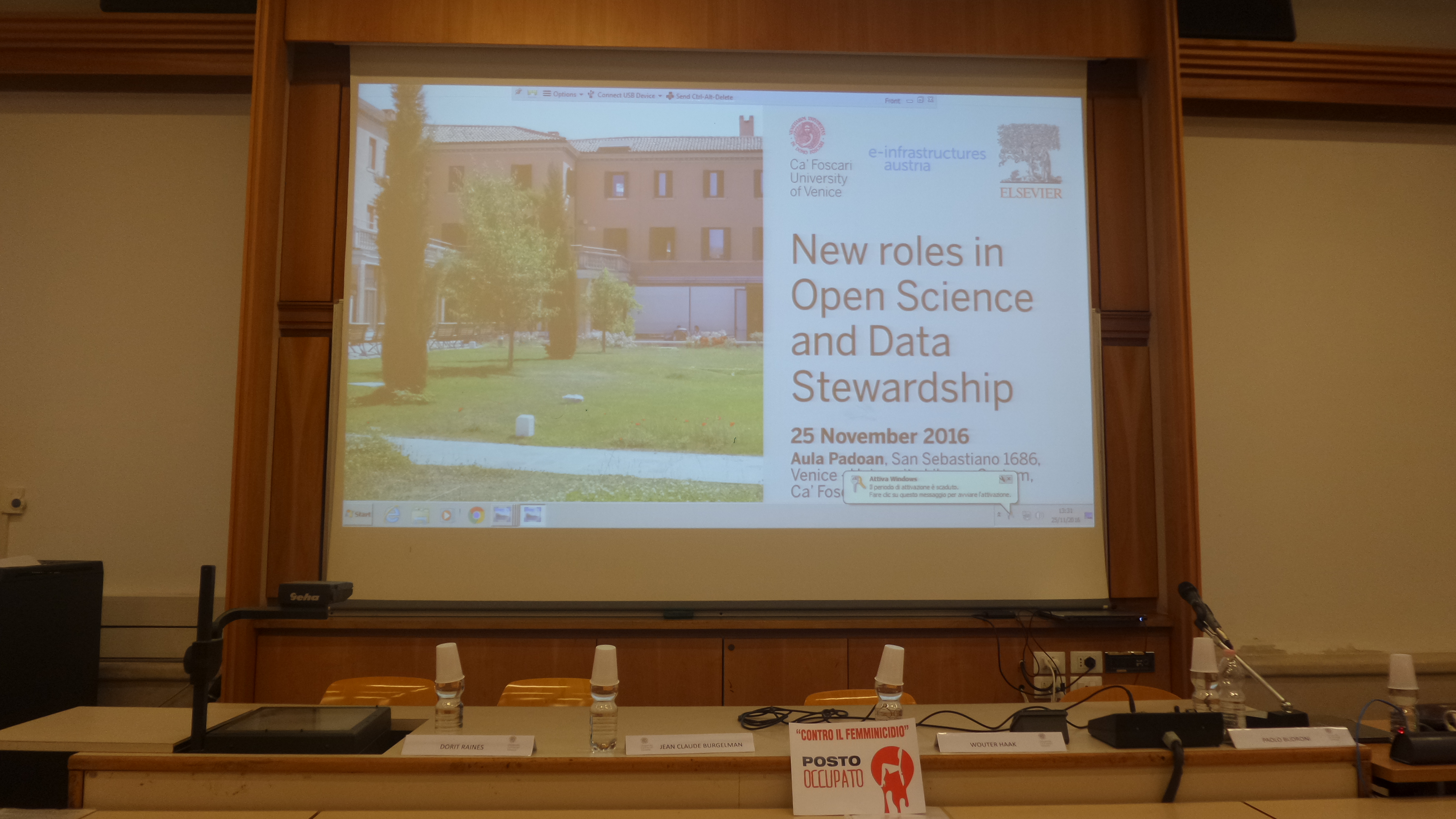 "Cartello esposto durante il workshop per onorare l’iniziativa “posto occupato"", attuata il 25 novembre Giornata Mondiale Contro la Violenza sulle Donne. L'iniziativa consiste nel tenere un posto vuoto ed in evidenza, nelle occasioni pubbliche, a simboleggiare l’assenza di una donna vittima di violenza.
