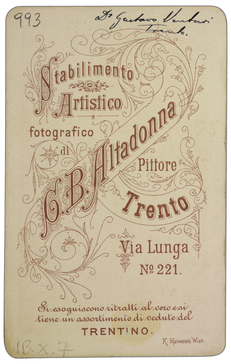 Titolo manoscritto sul recto, dove compaiono le note: fot. 1886; autg.; 1898 (data di morte). Nota manoscritta anche sul verso: Dr. Gustavo Venturi Trento.