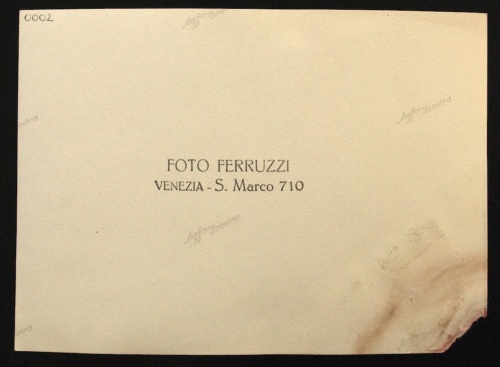 Verso della foto inv. n. 0002: timbro a inchiostro nero del fotografo con la scritta: "Foto Ferruzzi Venezia - S. Marco 710" al centro.