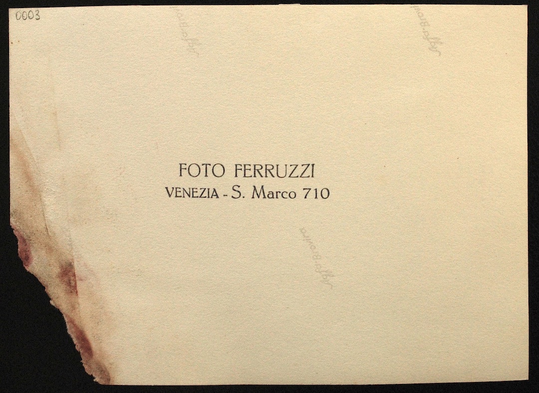 Verso della foto inv. n. 0003: timbro a inchiostro nero del fotografo con la scritta: "Foto Ferruzzi Venezia - S. Marco 710" al centro.