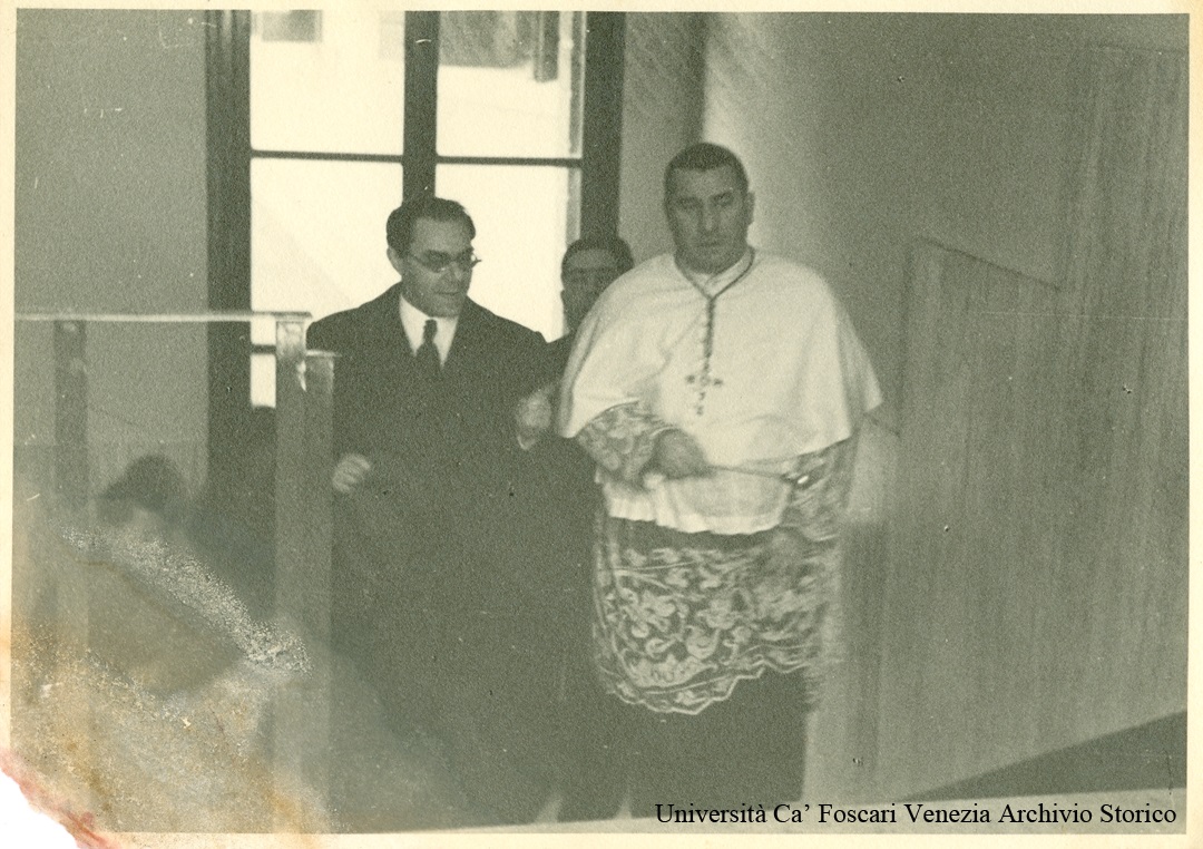 Il Patriarca di Venezia, Cardinale Adeodato Giovanni Piazza, e il rettore Agostino Lanzillo salgono la scalinata del palazzo Rio Novo (ora Palazzo dei pompieri), seguiti da un gruppo di studenti e docenti, per la visita alla biblioteca e al laboratorio di merceologia con annesso Museo, appena trasferiti da Ca' Foscari.