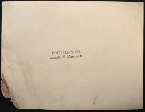 Verso della foto inv. n. 0010: timbro a inchiostro nero del fotografo con la scritta: "Foto Ferruzzi Venezia - S. Marco 710" al centro.
